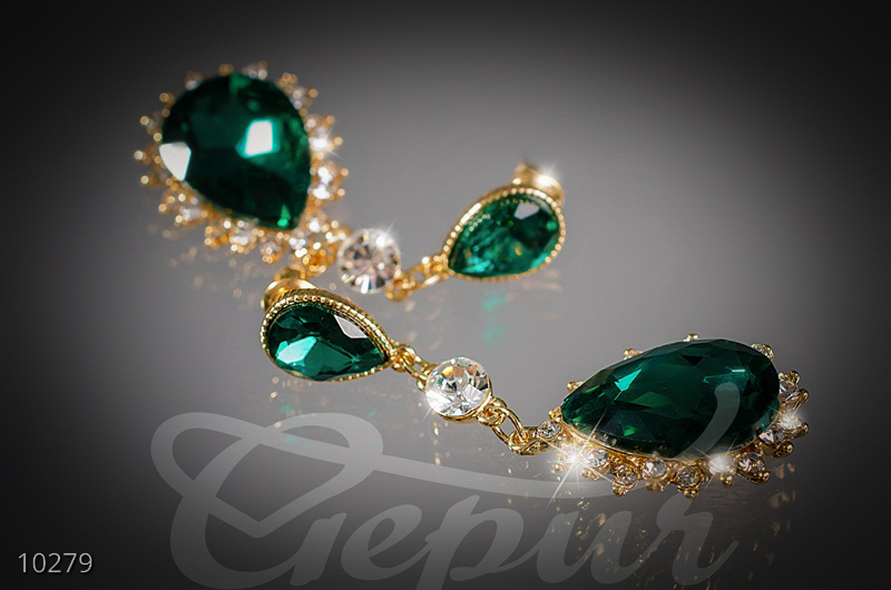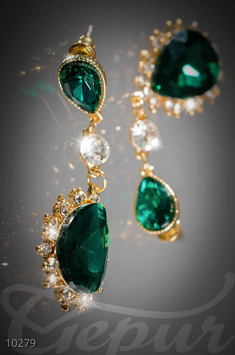 Серьги с большим камнем в форме капли, в золотом обрамлении с мелкими прозрачными камнями. Длина серёжек - 3,7см, Ш - 2см. Цвет: изумруд