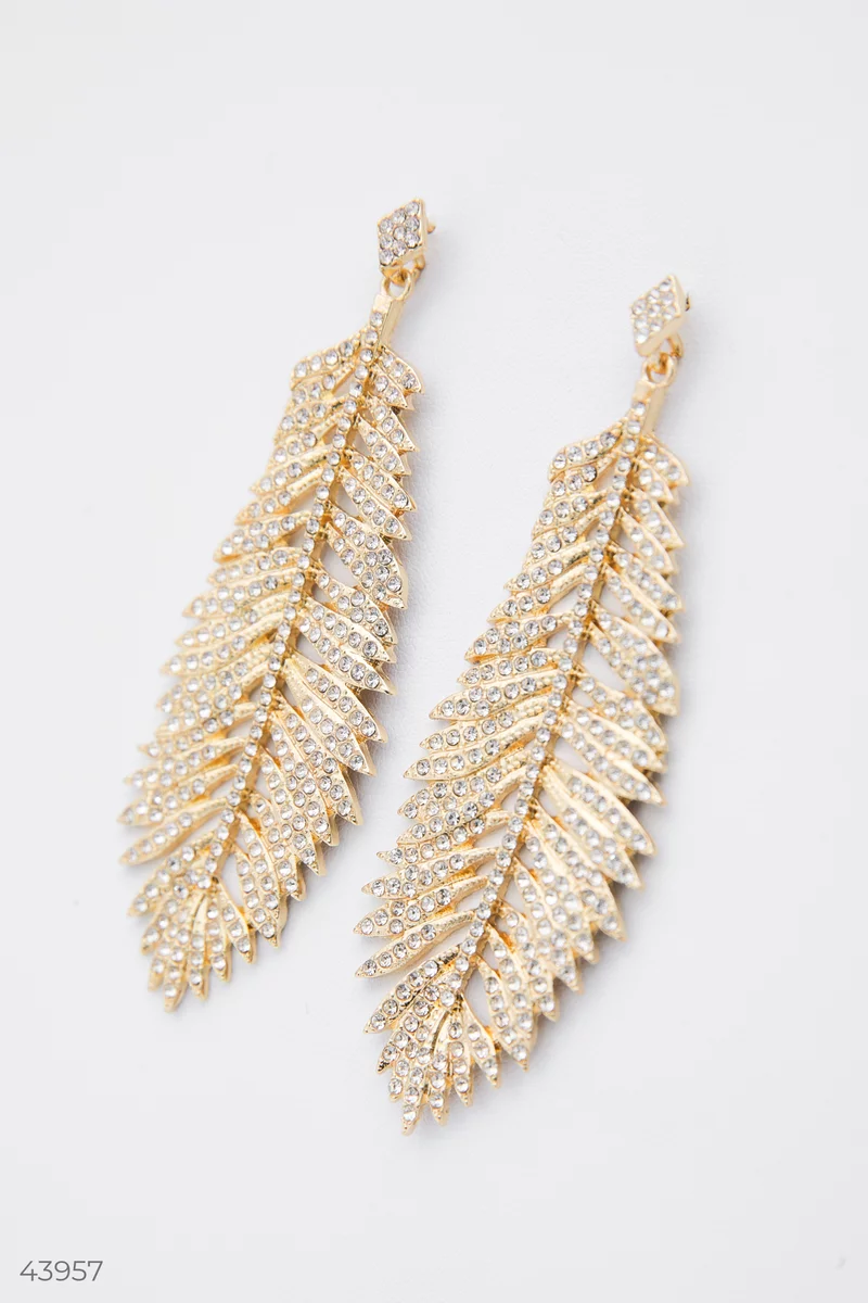 Стильні великі сережки-підвіски у вигляді пера. Основа виробу золотиста, зі стразами. Виконані з якісного біжутерного сплаву, при правильному догляді не темніє та довго служить. Основа виробу у золотистому кольорі. Зберігайте біжутерію в закритій скриньці, органайзері або шафці в розправленому вигляді.
