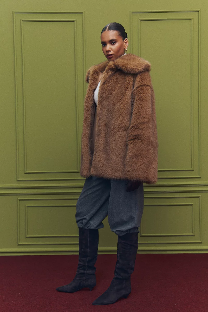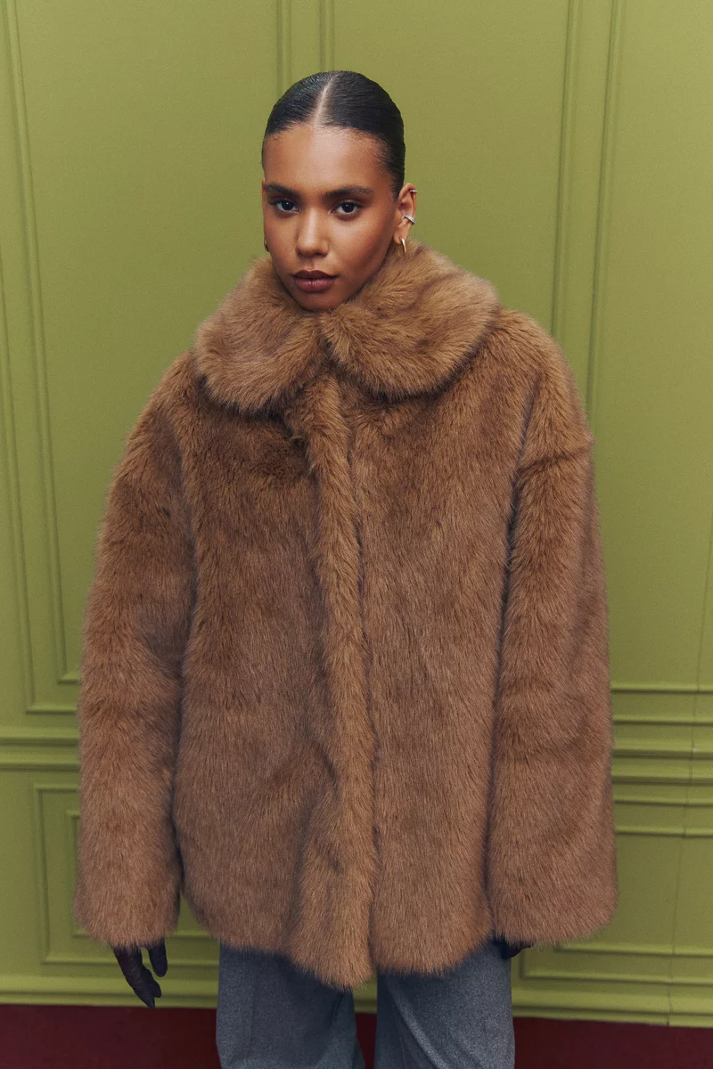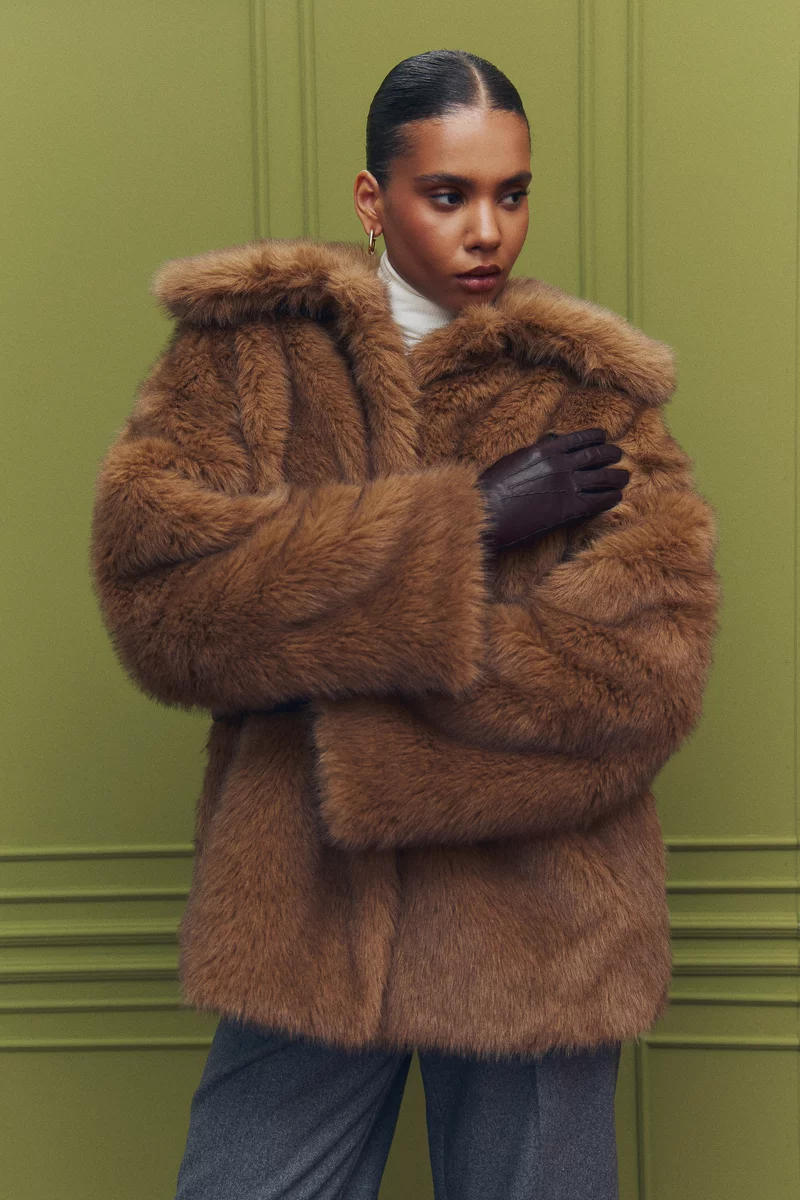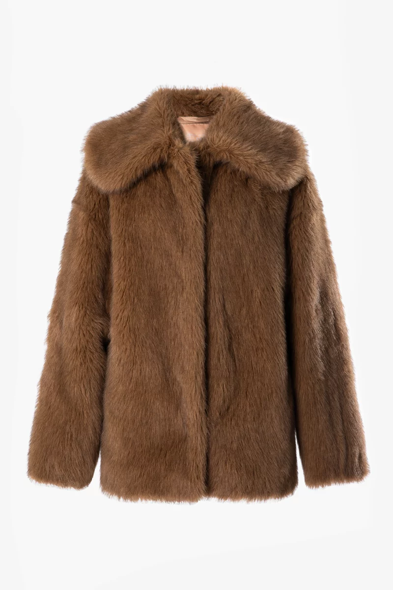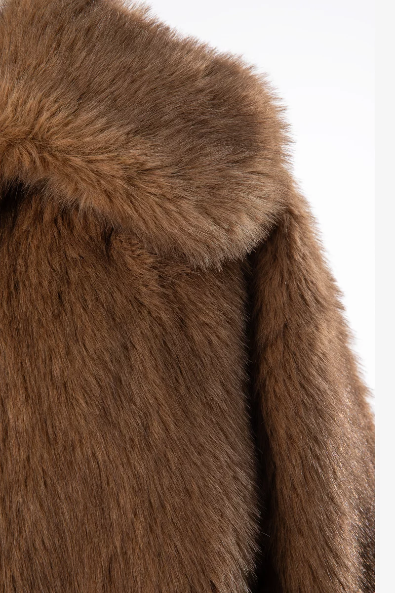 Подовжене пальто зі штучного хутра у карамельному відтінку