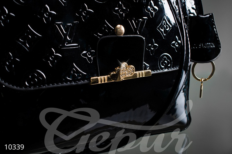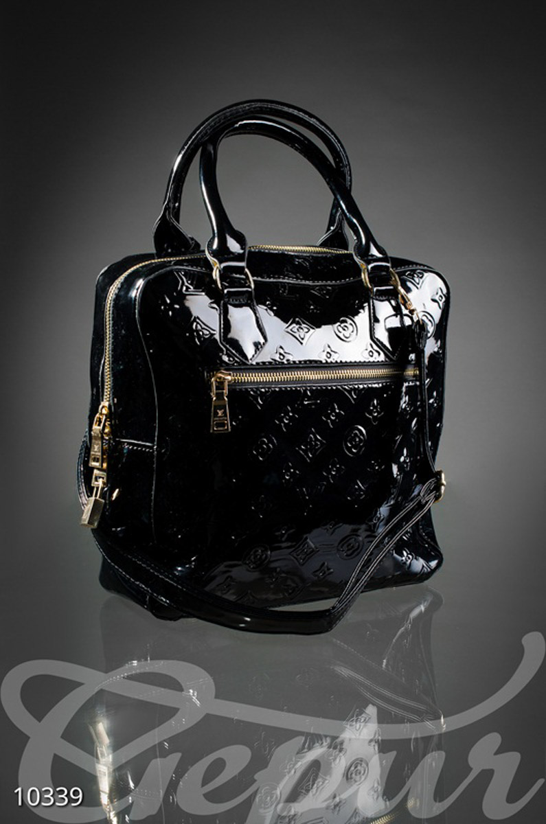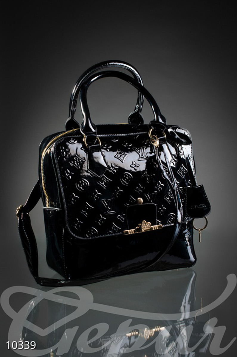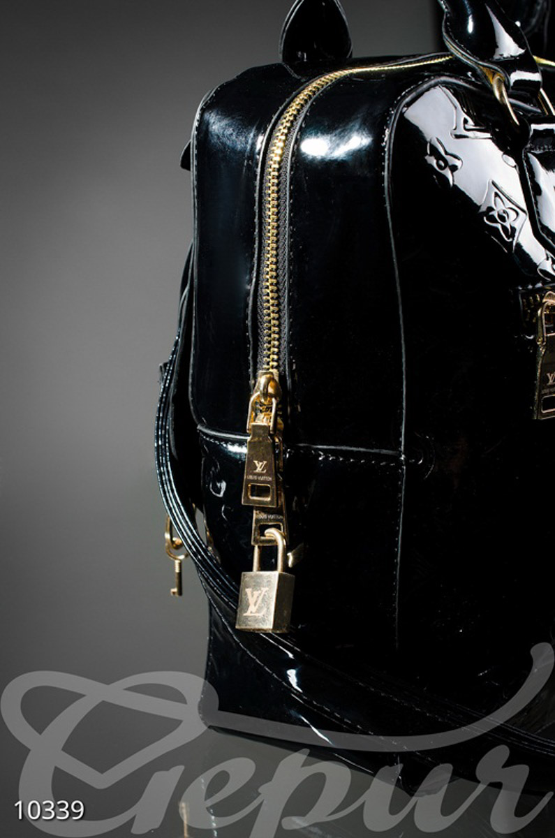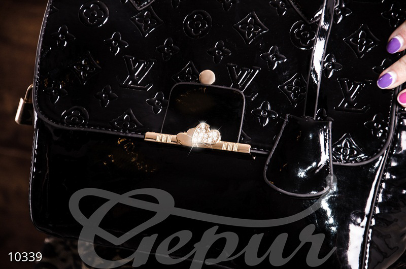 Сумка Louis Vuitton из лаковой эко-кожи, тисненная рисунками-лого. Застегивается на змейку с золотым замком, ключик в чехле. Внутри одно большое отделение, на боковых стенках 2 кармашка и небольшое отделение на змейке . В передней части сумки еще одно узкое отделение, которое закрывается верхним клапаном. Клапан декорирован золотым сердечком с камнями, застегивается на магнитную кнопку.Дно идет с золотистыми опорами-заклепками. Идет с регулируемым ремешком на плечо.