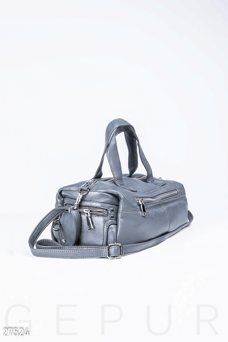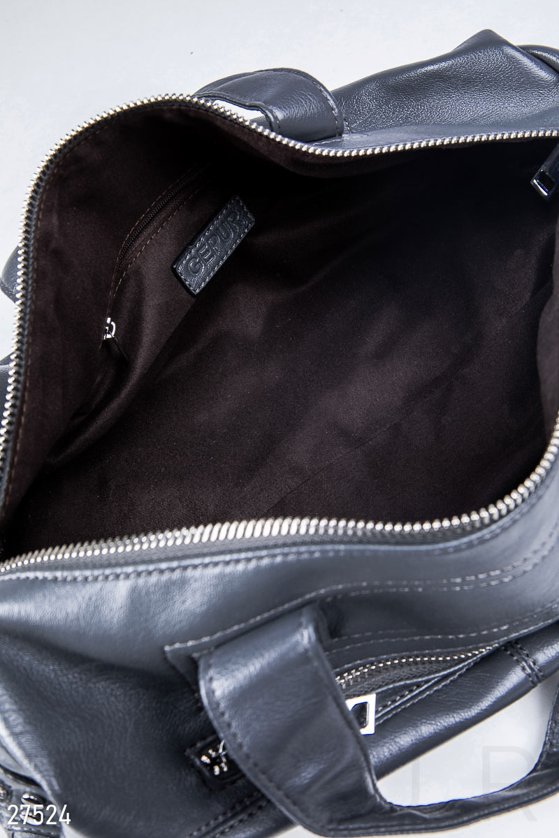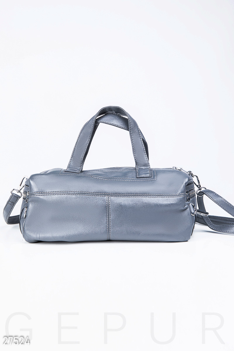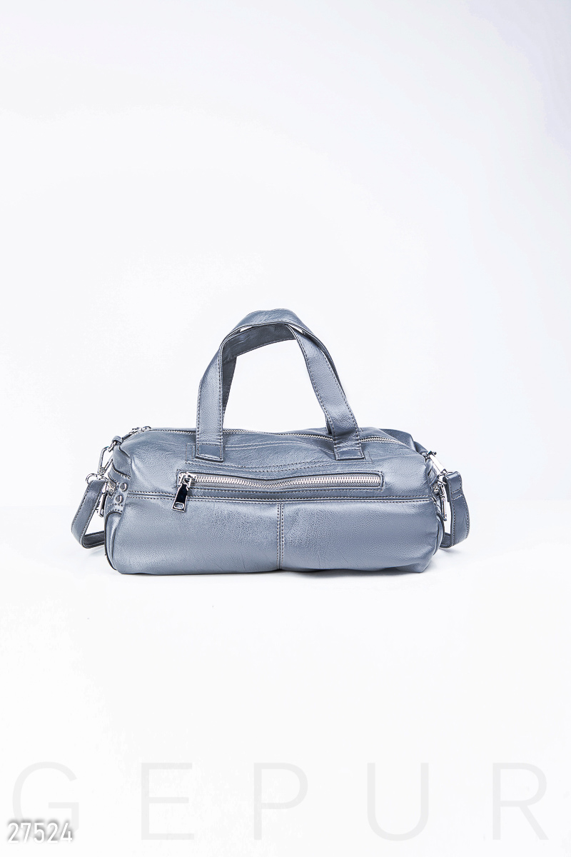 Универсальная повседневная сумка в стиле duffel, выполненная из мягкой эко-кожи: удобные короткий ручки, съемный плечевой ремешок и три боковых кармана на молнии. Внутри одно отделение, два открытых боковых кармана и один карман с застежкой на молнию.