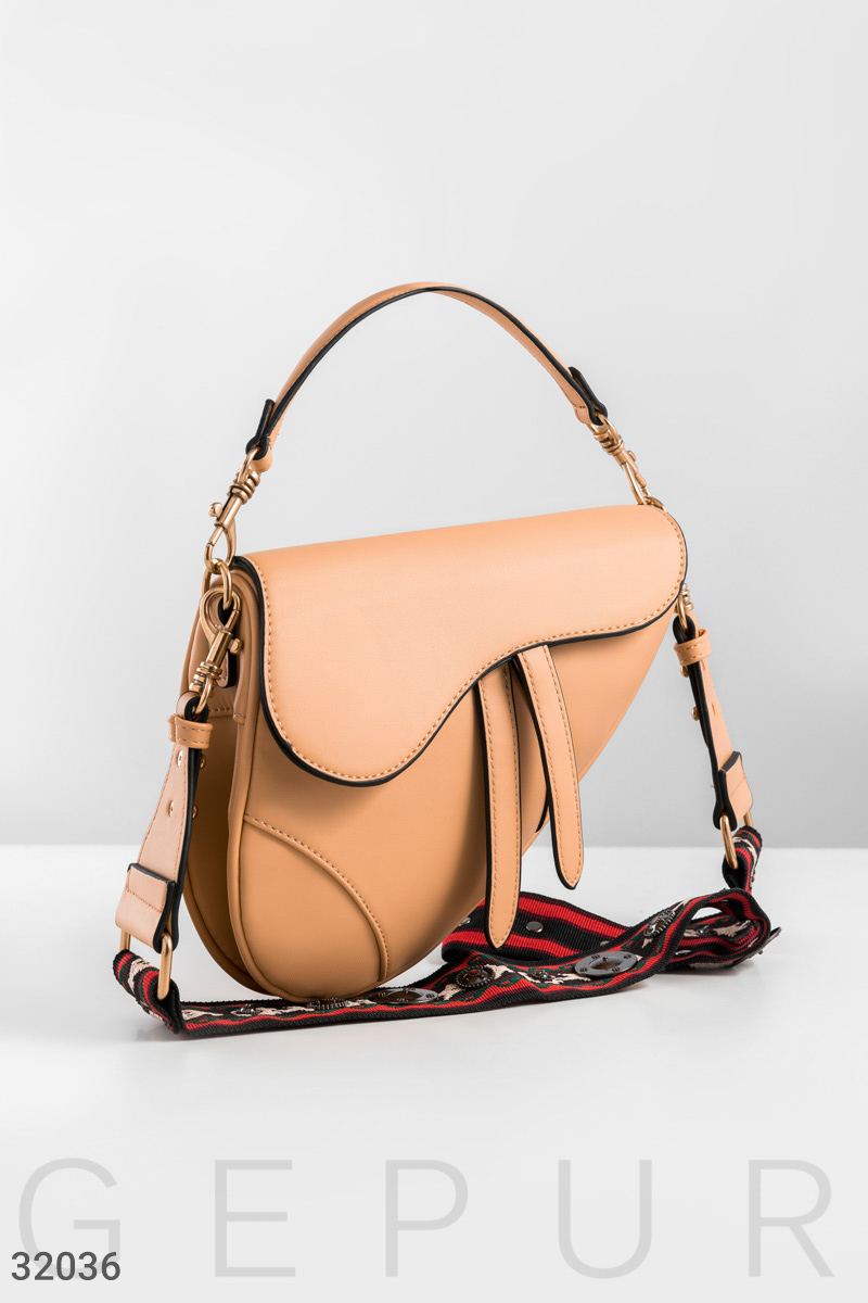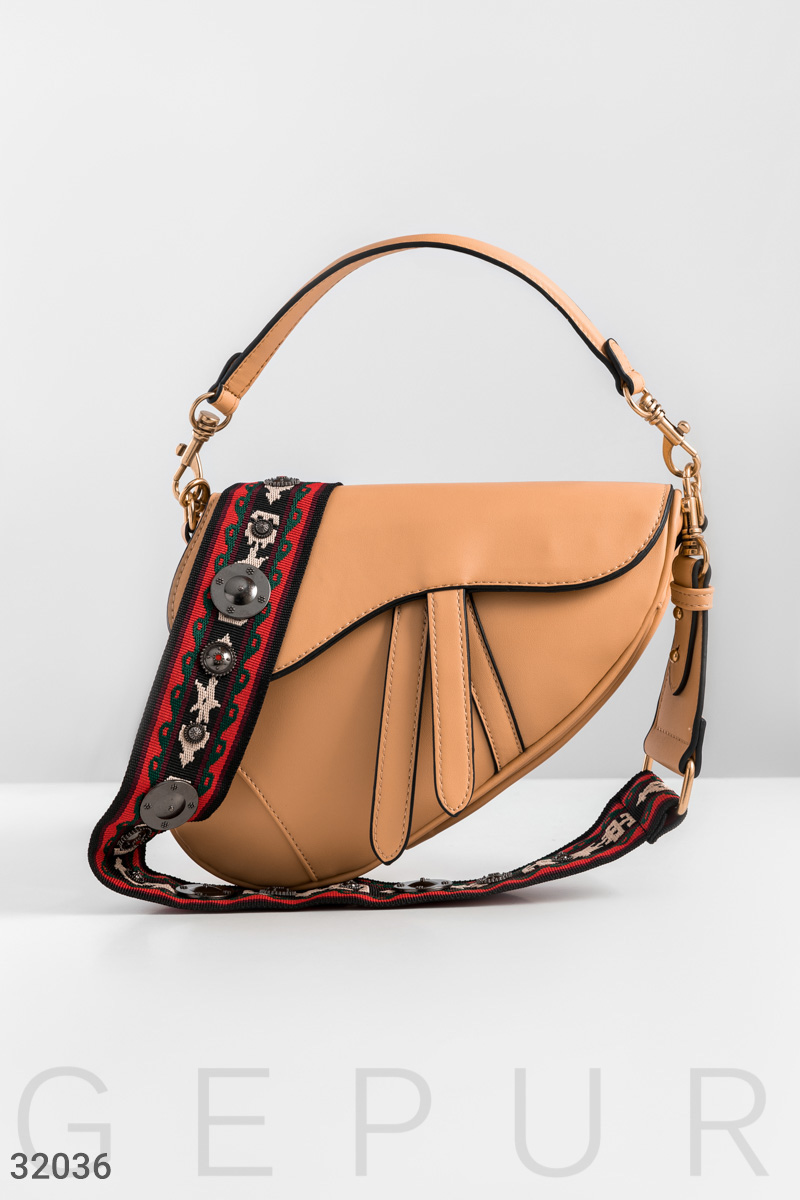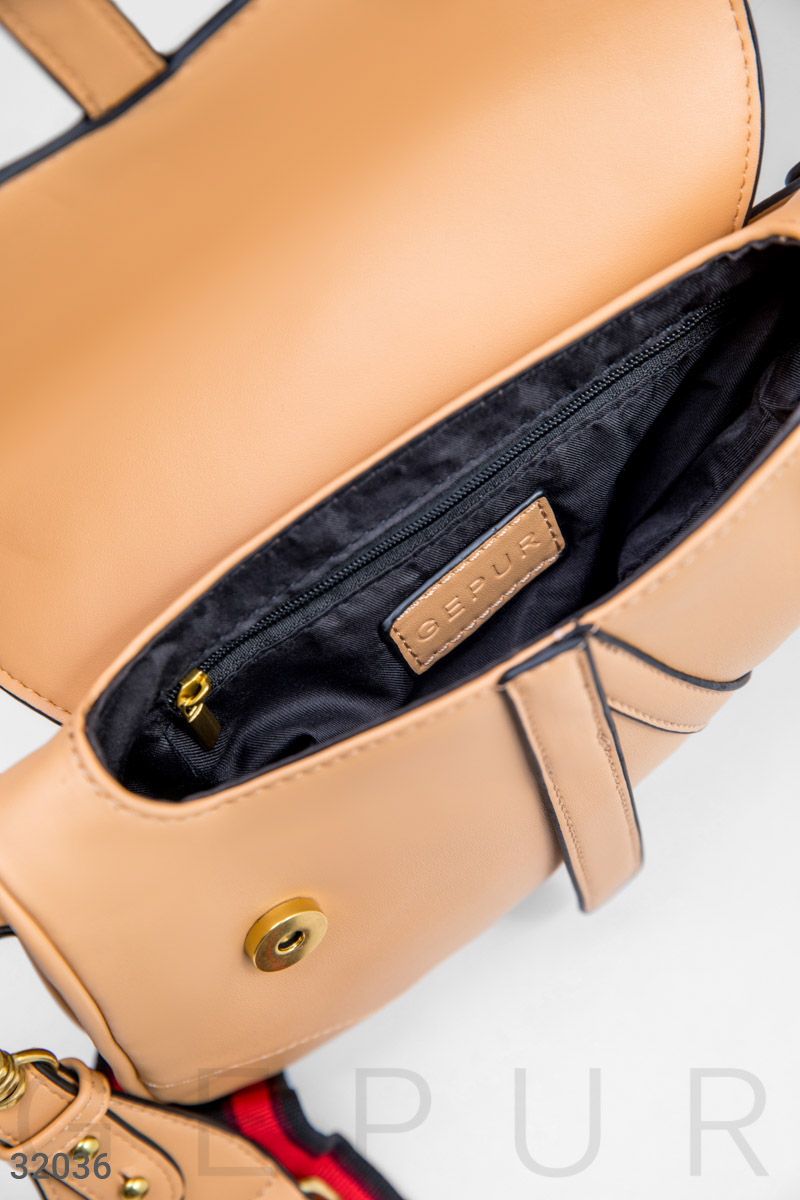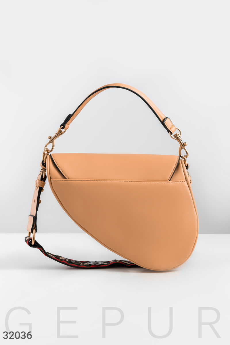 Акуратна бежева сумка оригінальної форми з широким знімним плечовим ременем і ручкою з еко-шкіри: одне невелике відділення з боковою кишенею на блискавці.