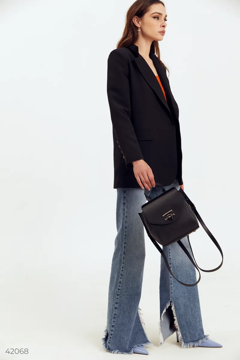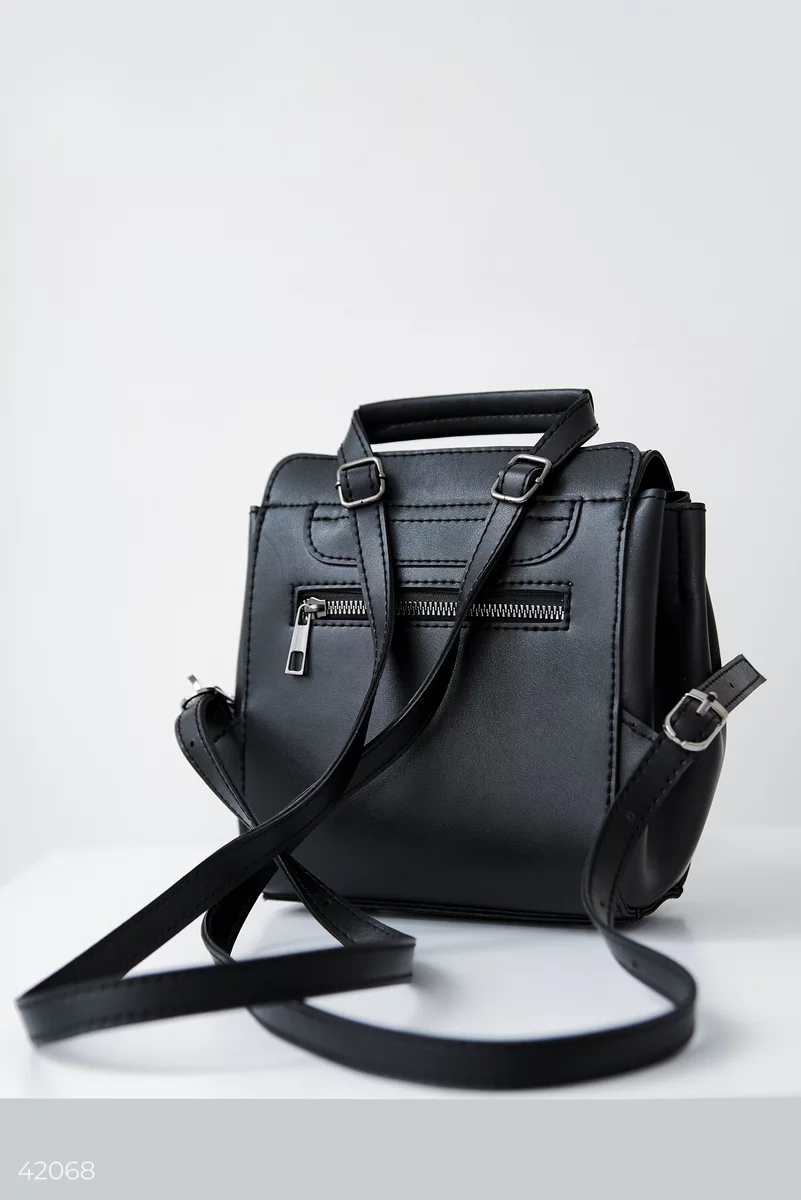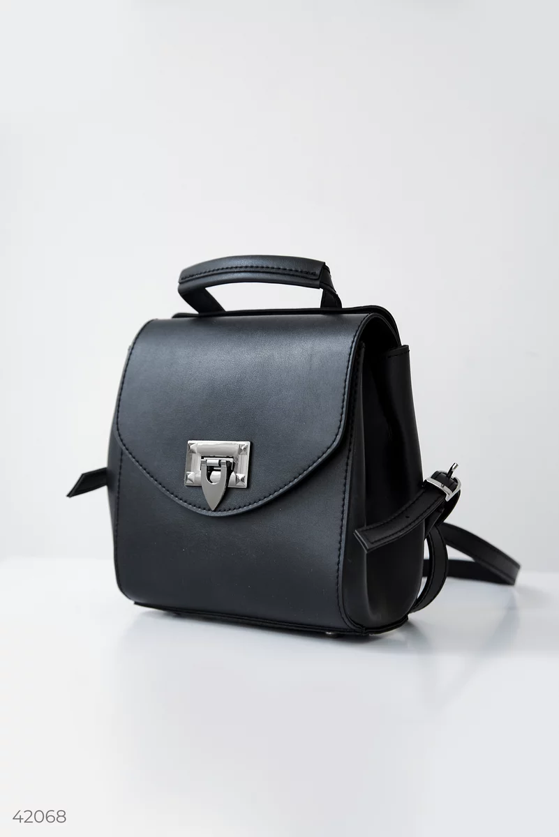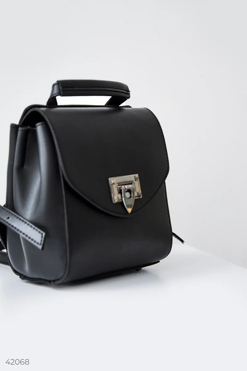 Оригінальна сумка-рюкзак суворої геометричної форми. Як основний матеріал була використана матова еко-шкіра. Акуратний клапан з поворотною застібкою та металевим декором, додаткова кишеня на блискавці та вузькі лямки, які можна регулювати по довжині.