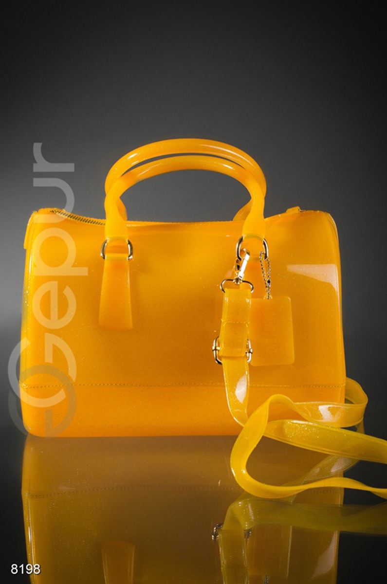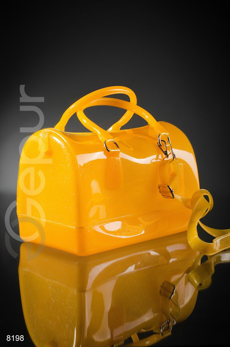 Сумка Furla большая из каучука с блестящим напылением. Твердый каркас и дно. Одно большое отделение на змейке. Имеет форму боченка, две ручки и один пристегивающийся ремешок с регулятором длины, пристегивается на карабинчики.