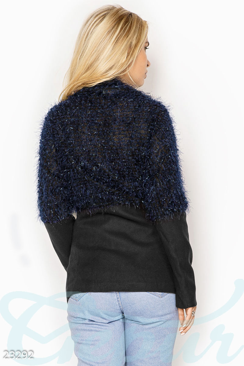 Интересный свитер-пиджак: верх - выполнен из пряжи травка, немного колется, хорошо тянется, с высокой необычной горловиной, цвет Серо-бело-черный, как на фото. Низ - плотный эко-кашемир черного цвета, на нем будет видно все волосинки и др. сильно...Детальніше