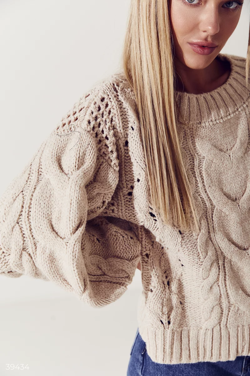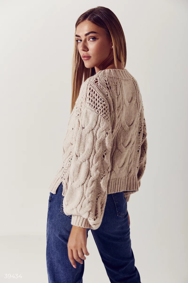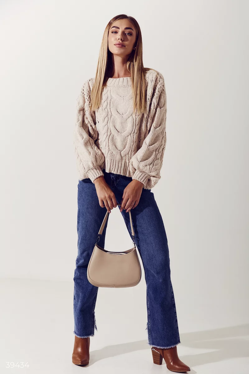 Джемпер выполнен в нежном бежевом цвете из мягкого трикотажа. Трендовые пышные рукава актуальны не только в рубашках, но и в трикотажных свитерах. Тенденцию добавлять в изделия данный элемент поддержали такие бренды, как Alexander McQueen и JW Anderson.