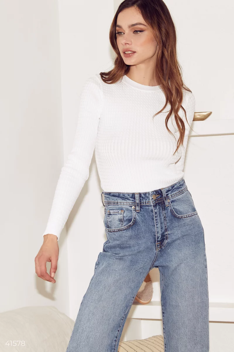Джемпер облягаючого крою молочного кольору. Модель виконана із трикотажного полотна з фігурним плетінням.