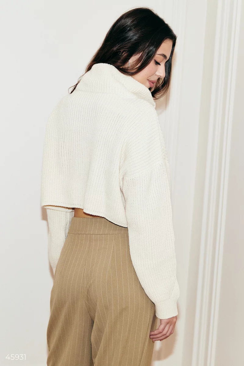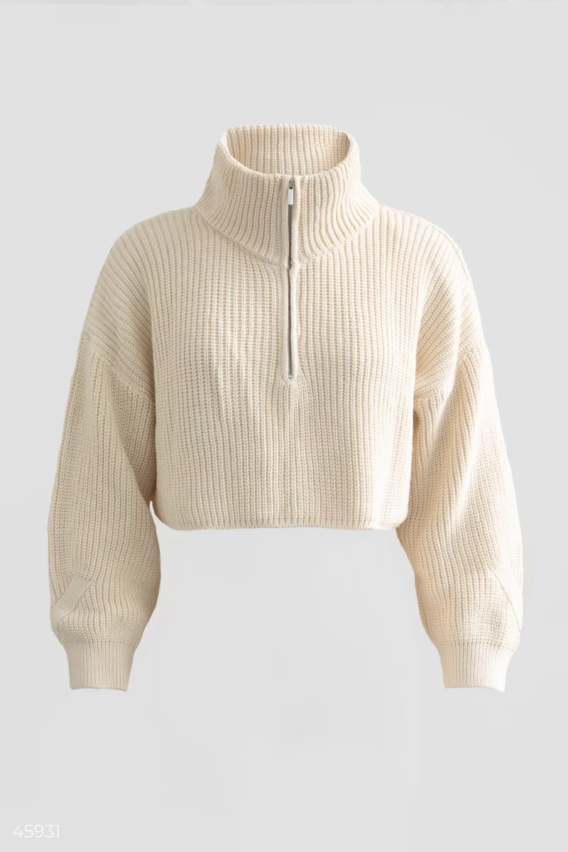 Стильний кроп-светр розширеного прямого крою - must have гардеробу на холодний період. Модель із високою горловиною на блискавці, стилізована заниженою лінією плеча. Комір та рукава на еластичній манжеті. Можна поєднувати із класичними штанами, джинсами чи спідницею з високою посадкою. Зберігайте у складеному вигляді, щоб уникнути витяжки.