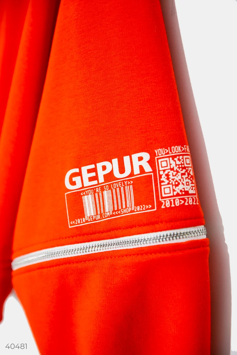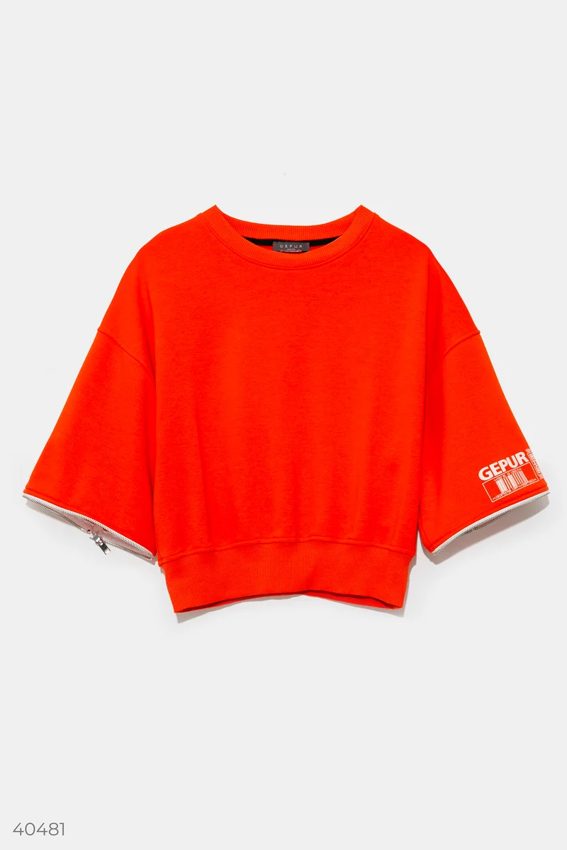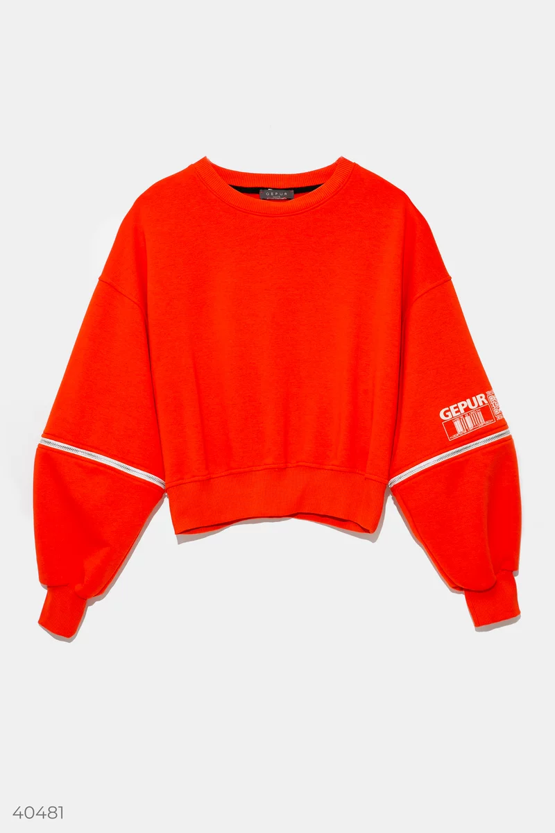 Яскравий помаранчевий світшот, виконаний із сумішевої бавовни. Модель стилізована дизайнерами Gepur блискавками на рукавах, які дозволяють додати моделі родзинку, розстебнувши їх частково або повністю. Такий світшот відмінно виглядатиме з джинсами, або трендовими спідницями, що плісують.