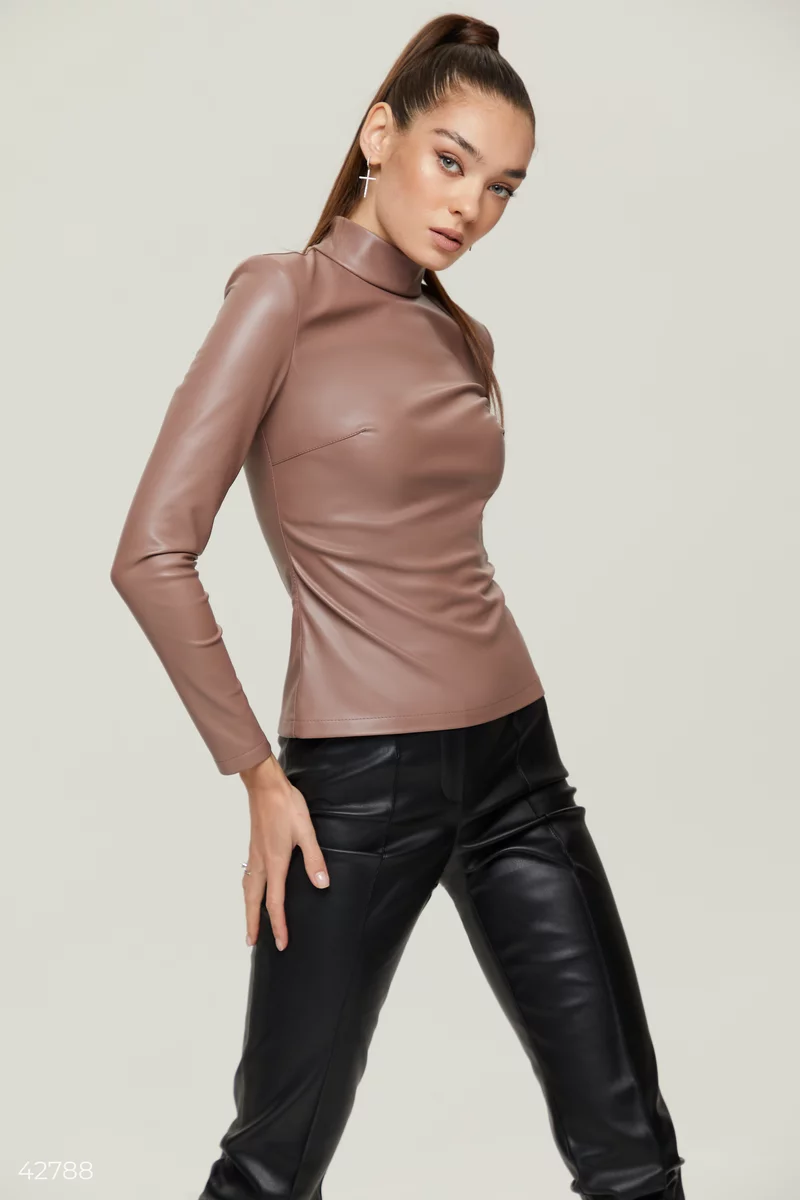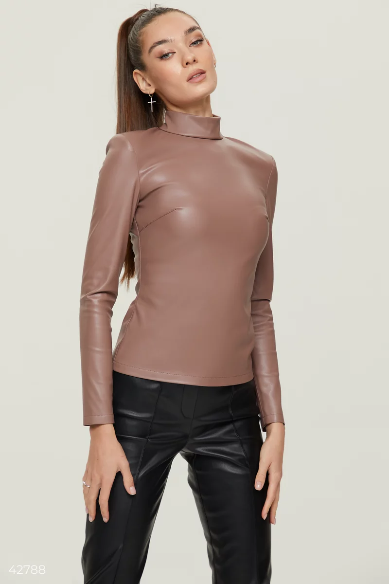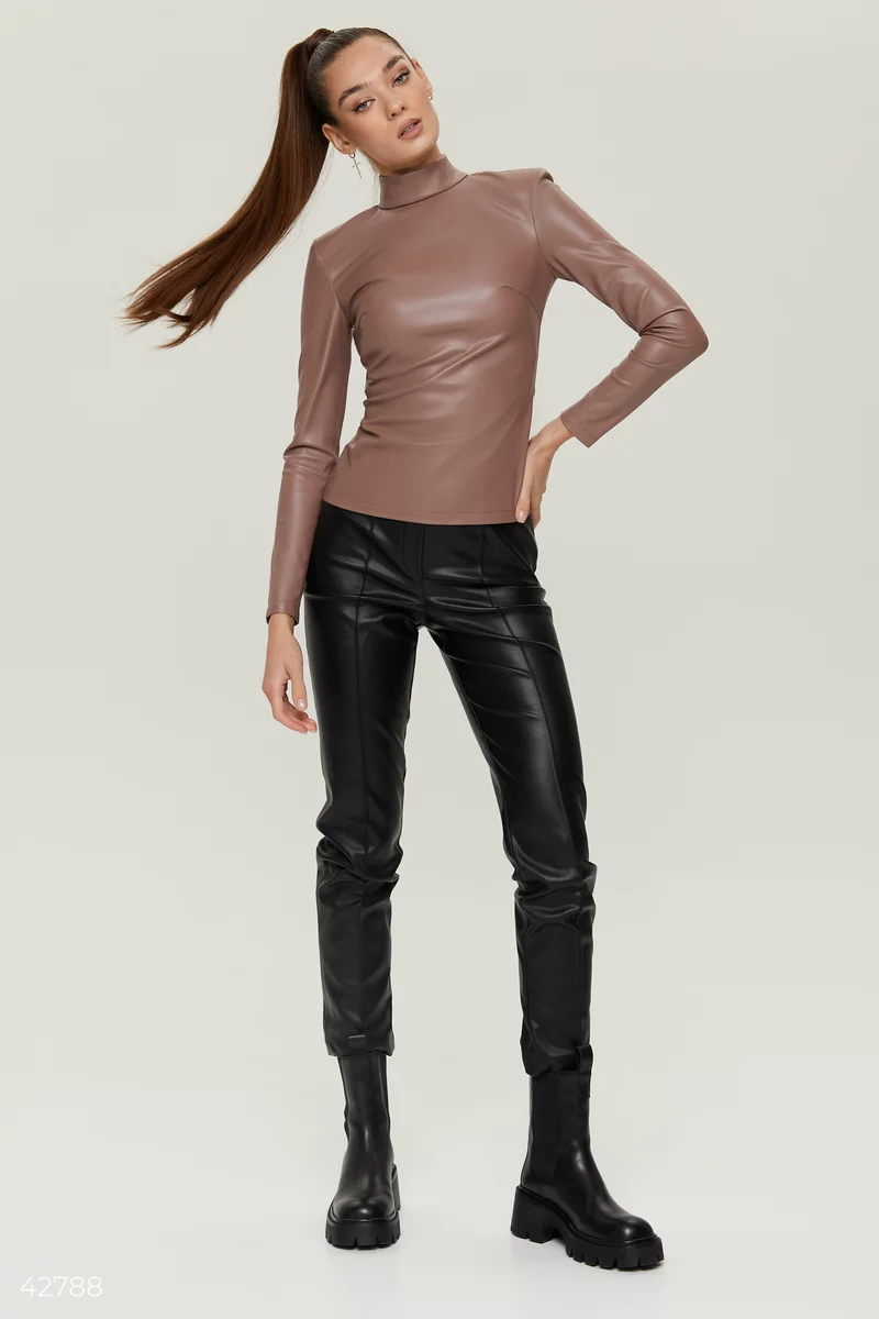 Водолазка голосно заявляє про себе: модель виконали з м'якої штучної шкіри, яка не втрачає актуальності в сезоні 2022-23. Матеріал має гладку фактуру із внутрішньою трикотажною основою, тому виріб комфортно облягає фігуру. Плечі підкреслюють поролонові вставки.