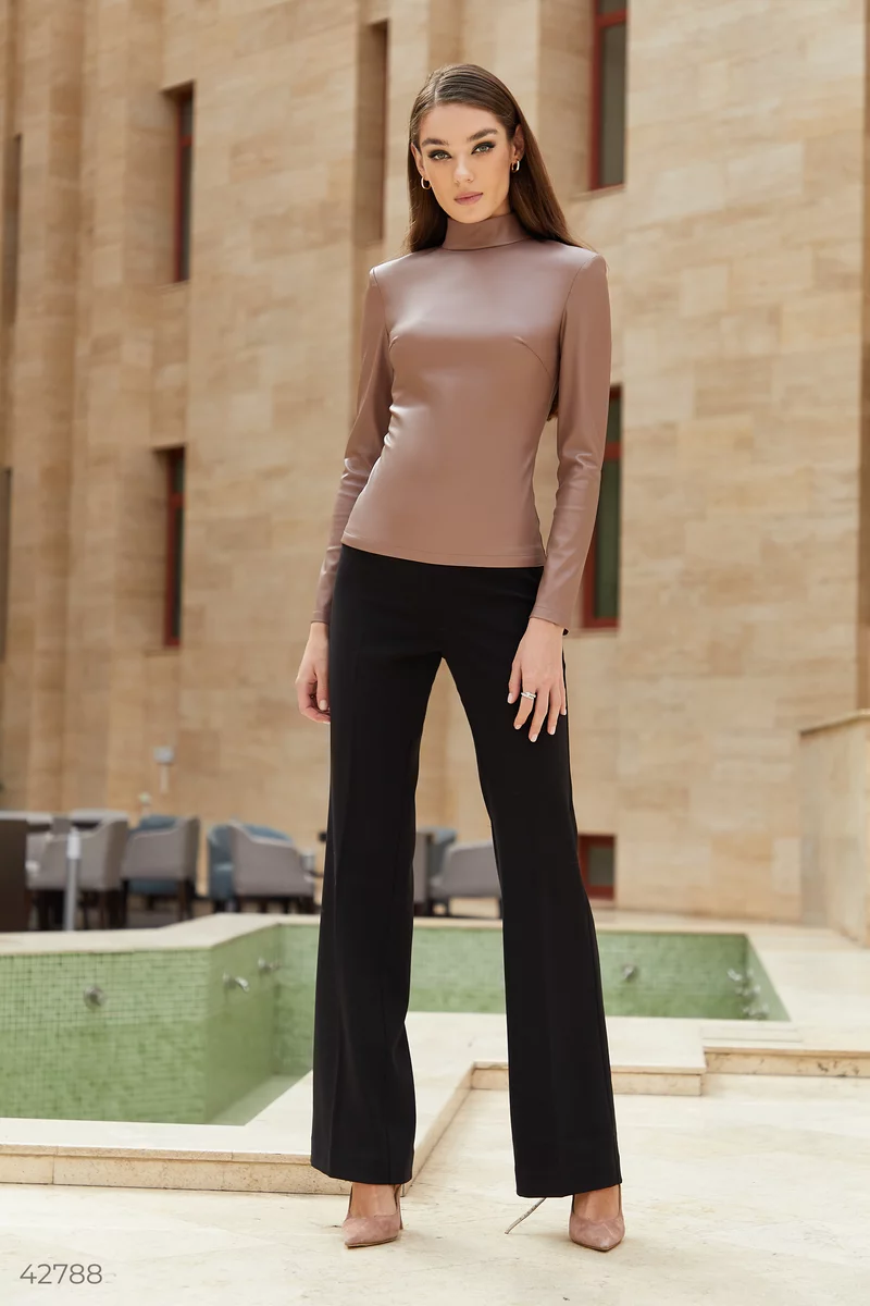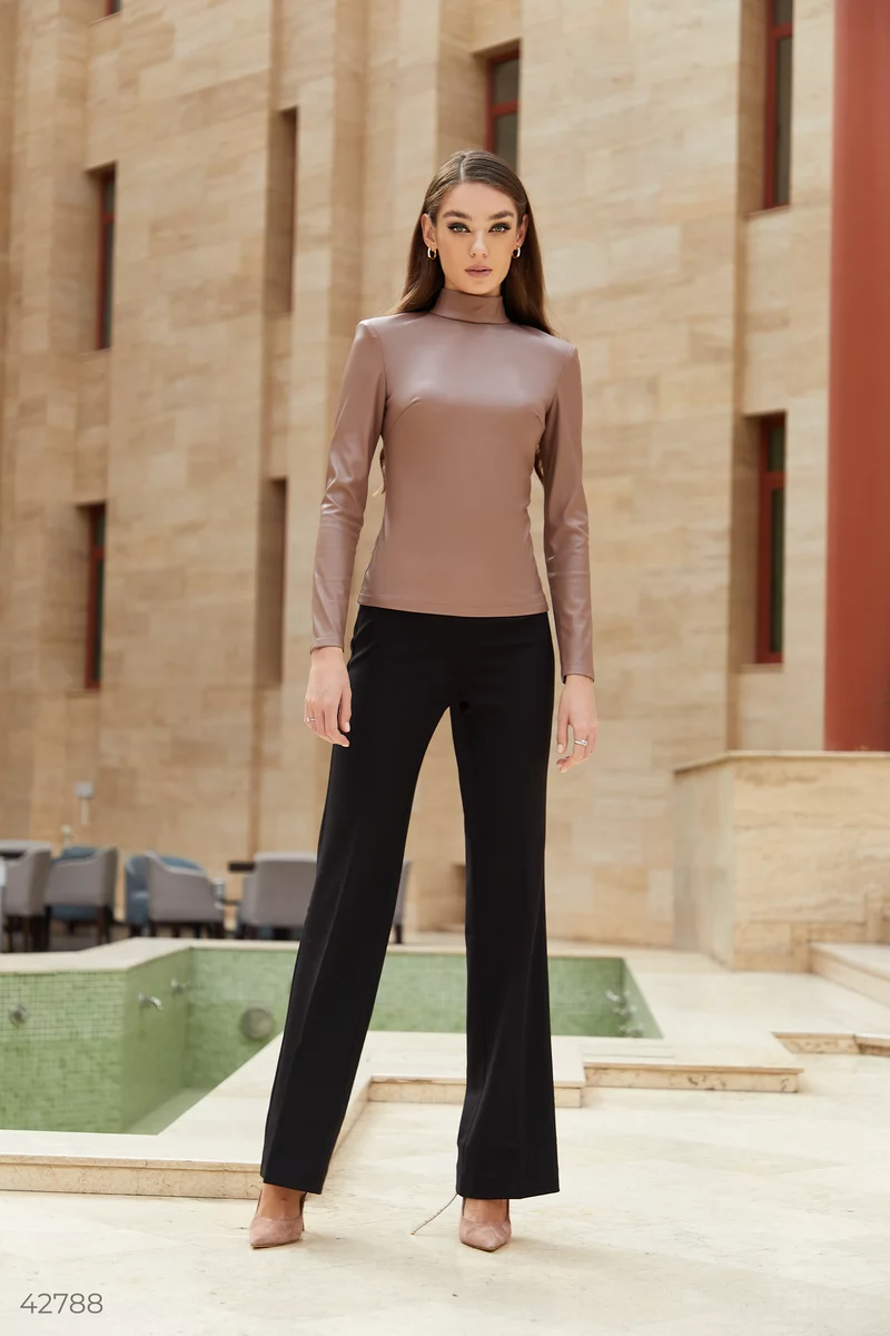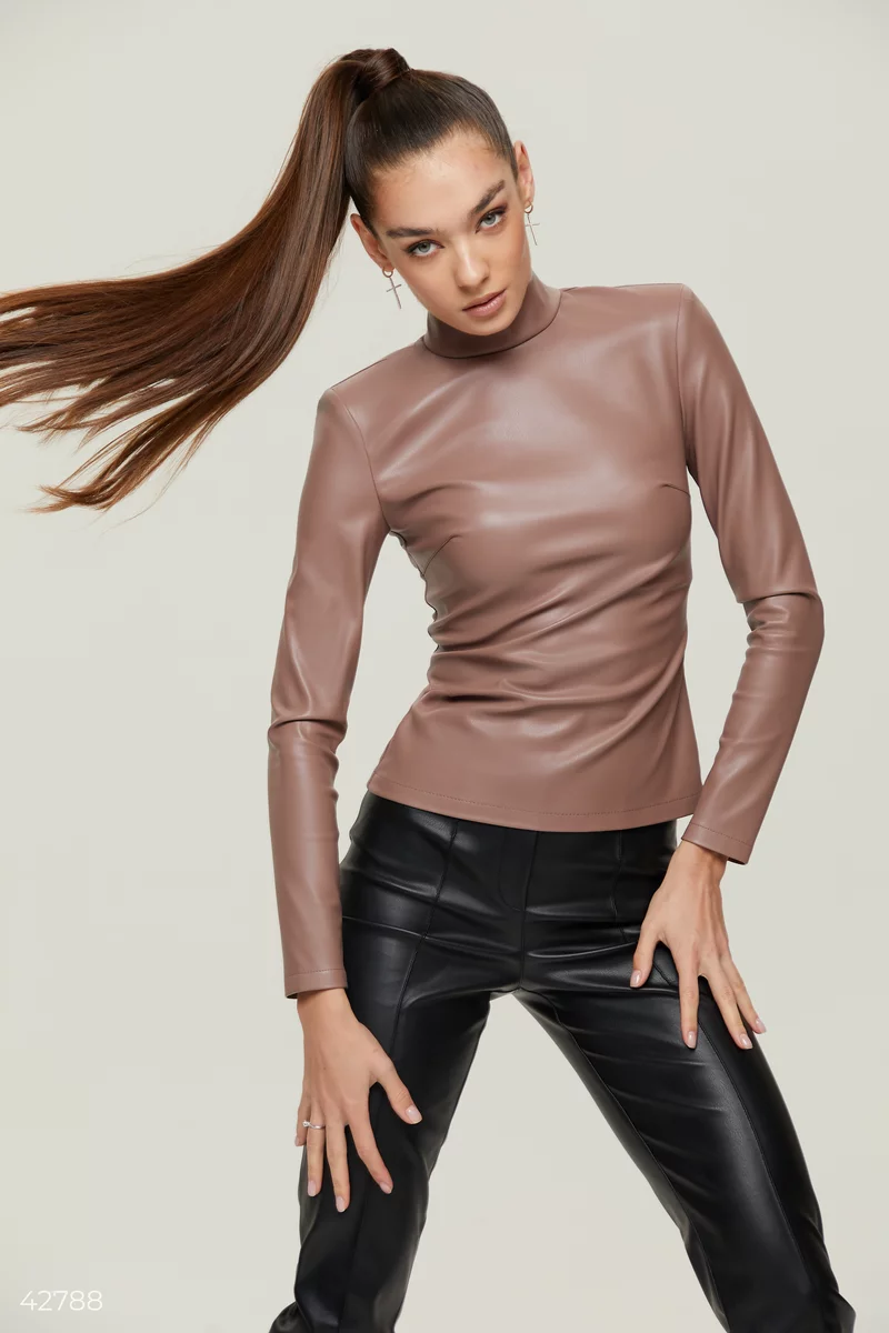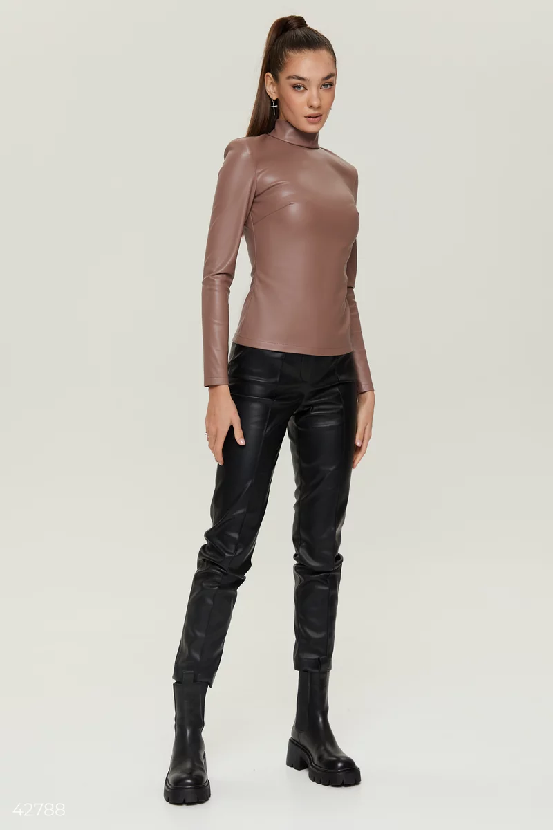 Водолазка голосно заявляє про себе: модель виконали з м'якої штучної шкіри, яка не втрачає актуальності в сезоні 2022-23. Матеріал має гладку фактуру із внутрішньою трикотажною основою, тому виріб комфортно облягає фігуру. Плечі підкреслюють поролонові вставки.
