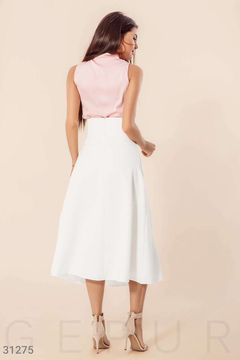Расклешенная юбка с завышенной талией, широким поясом, защипами и двумя карманами в швах.