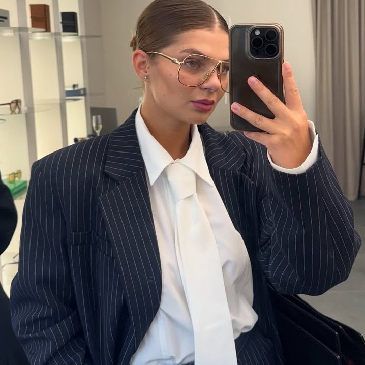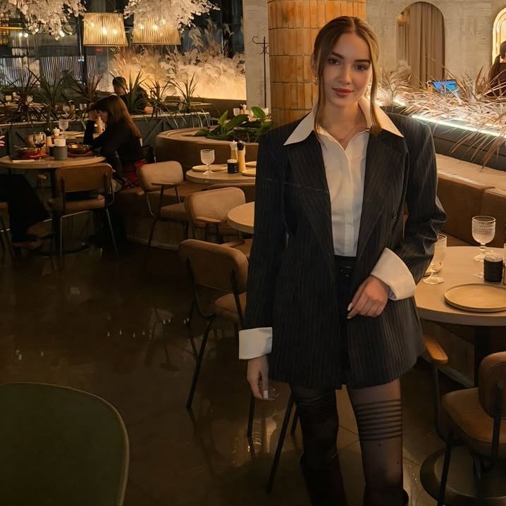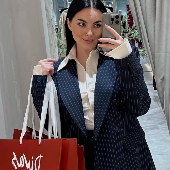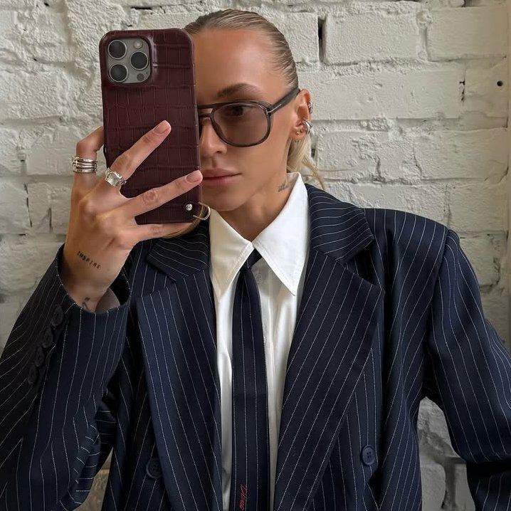 Базовий двобортний жакет з костюмної тканини із принтом у смужку. Акцентна вишивка Divas do business під клапаном. Застібається на гудзики. У плечах передбачені додаткові вставки для збереження строгих ліній. Жакет із моделюючими виточками і підкресленою талією. На підкладці