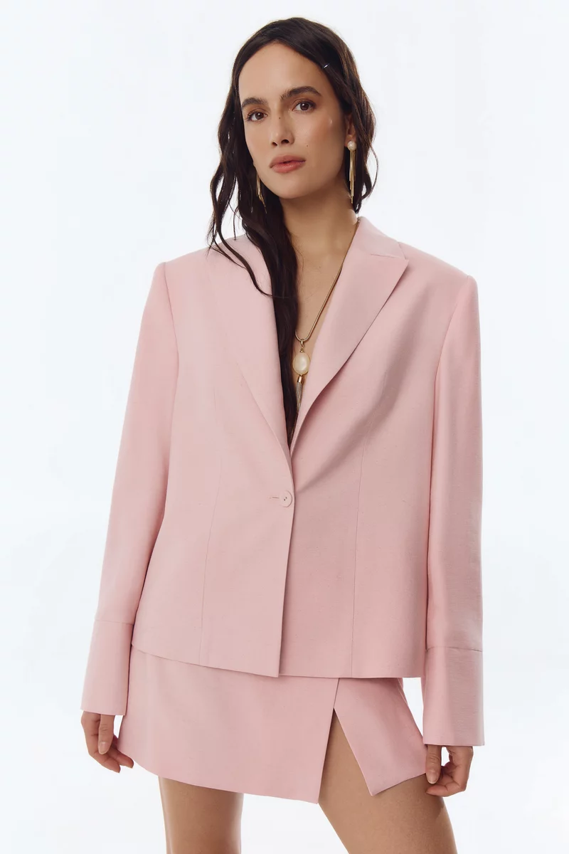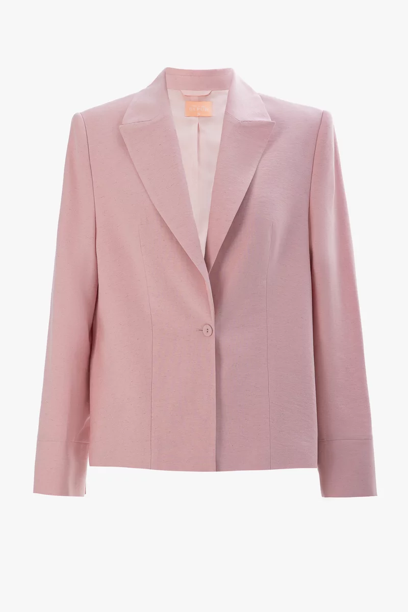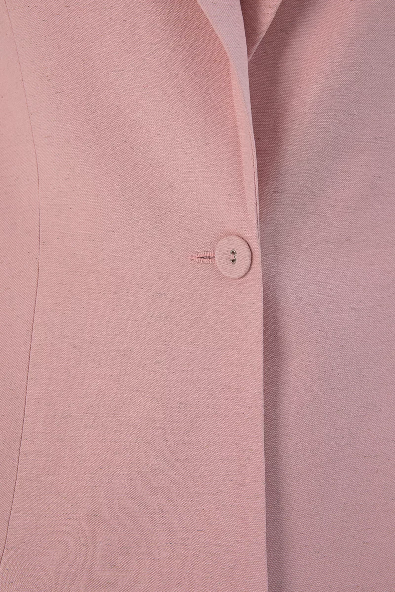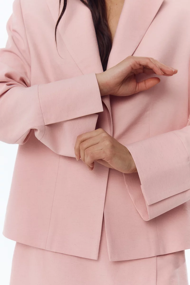 Базовий однобортний жакет вільного прямого крою із приємної до тіла костюмної тканини з додаванням льону. Застібається на гудзик. У плечах передбачені додаткові вставки для збереження строгих ліній. На підкладці