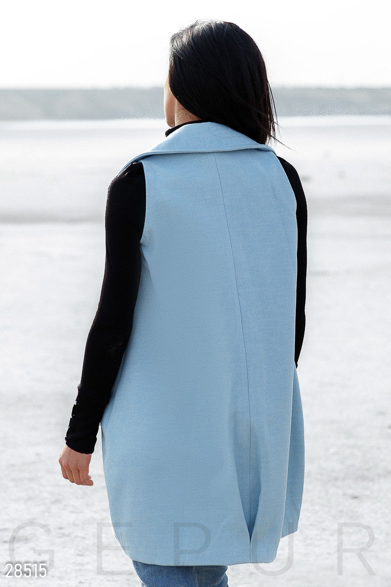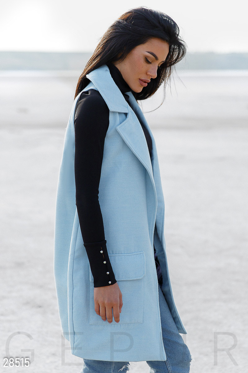 Удлиненный жилет с лацканами и двумя накладными карманами, выполненный из плотного эко-кашемира.